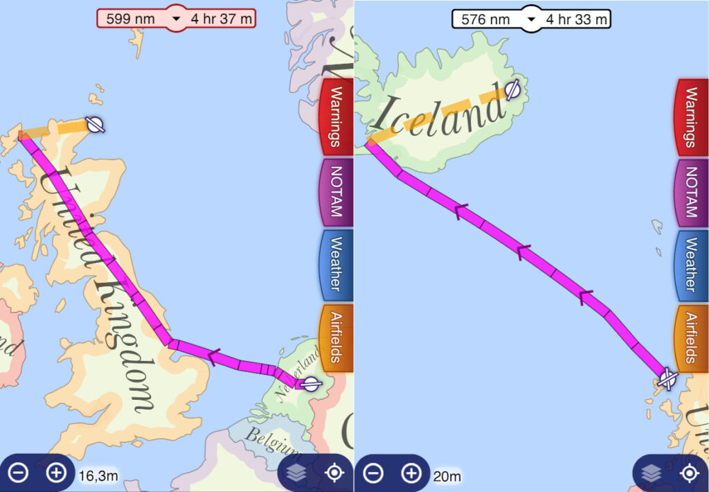 Nadat we de agenda’s naast elkaar gelegd hebben kon de (heen)reis plaatsvinden na 18 juli. Ik had gehoopt op zaterdag de 20e (tot donderdagmiddag was ik nog druk met werk), maar het weer bepaald uiteindelijk het vliegmoment. Maar eerst een stap terug. Om naar IJsland te vliegen in een Ultralight is wat papierwerk nodig. Eerst de toestemming van het VK om daar over land te vliegen. Initieel hebben we ook Denemarken gevraagd om naar Groenland te vliegen en daar een paar dagen te blijven (wat mij erg cool leek), maar dat zag Denemarken niet zitten en we kregen geen toestemming. Controles, tijd, en dat ‘ultralights in principe’ geen toestemming krijgen waren de redenen. Volgend jaar nog maar eens proberen en deze reis had dus als eindbestemming Reykjavik.