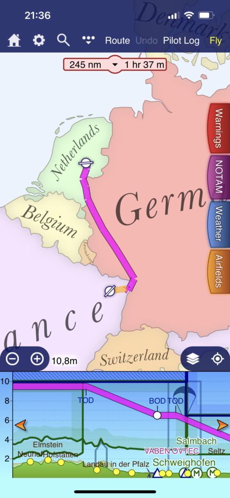 Zoals voor elke internationale vlucht verplicht is begon de reis met plannen van de route en indienen van die route als vliegplan. De route was vrij snel gemaakt. De grens over naar Duitsland, 8500ft hoog vliegen (ongeveer 2600m), door naar Haguenau, Frankrijk (net boven Straatsburg) dalen, landen, WIFI adapter kopen en lunchen. De geplande (enkele) vluchttijd was 1 uur en 34 minuten.